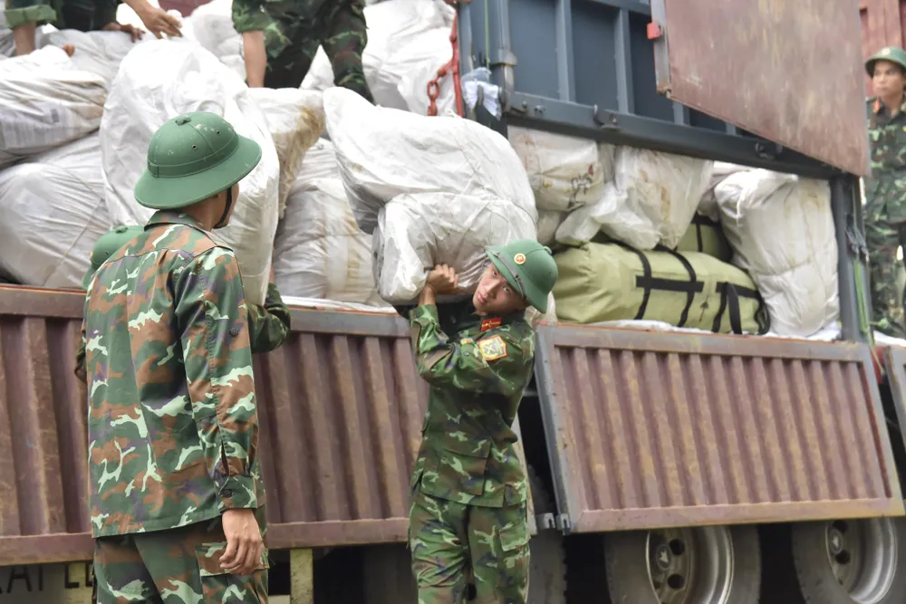 Các cán bộ chiến sĩ cẩn thận vận chuyển hàng hóa. Ảnh: NGUYỄN DO