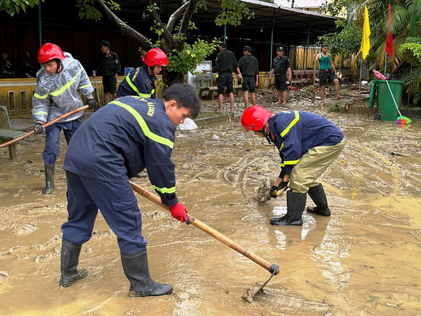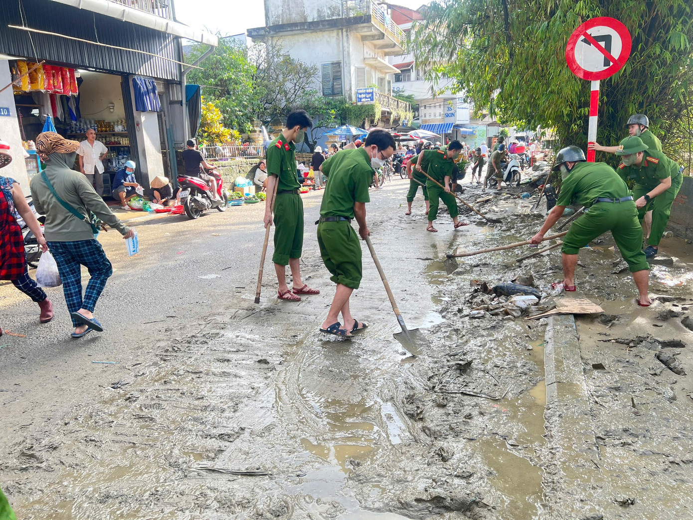 Bên cạnh lực lượng tại chỗ, TP Huế còn nhận được sự chi viện từ Công an tỉnh Quảng Trị. Đoàn công tác gồm 104 cán bộ, chiến sĩ Công an Quảng Trị đã vào Huế phối hợp cùng công an địa phương bắt tay ngay vào việc dọn bùn, rác và khơi thông hệ thống thoát nước.