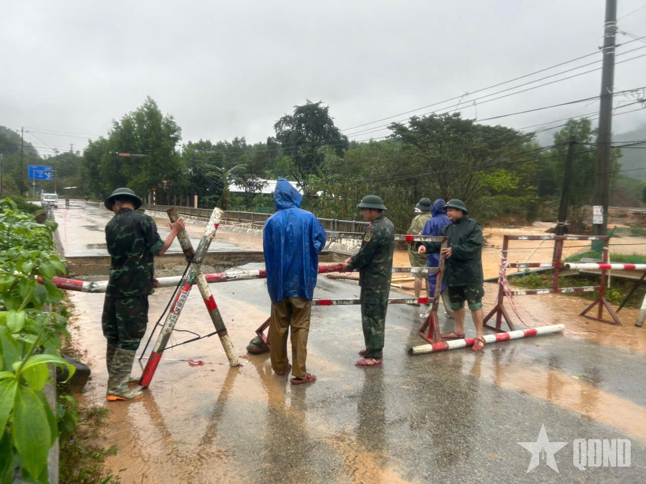 Mố cầu Phú Mậu bị sập, bộ đội, dân quân lập chốt bảo đảm an toàn cho người, phương tiện tham gia giao thông.