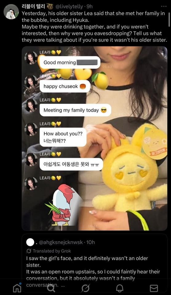 Cụ thể, các fan đã dẫn lại tin nhắn trên nền tảng Bubble của LEA - chị gái của Heuning Kai. Cô nói rằng mình và gia đình đã có một kế hoạch đoàn viên nhân dịp lễ Chuseok. Có thể sau buổi hội họp, LEA, Huening Kai và các thành viên khác trong gia đình đã đi uống tại quán bar. Điều này đồng nghĩa, cô gái trong video có thể chỉ là người thân của chàng em út nhà TXT.