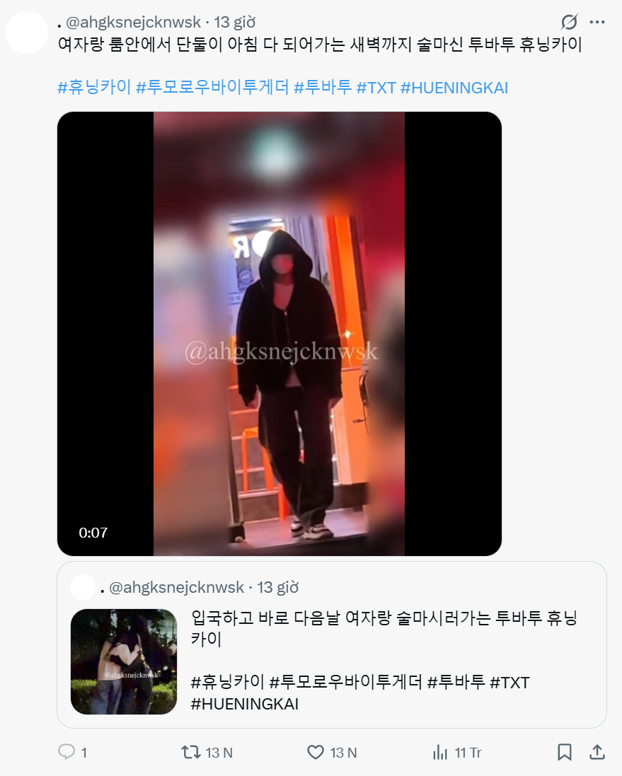 Mới đây, một tài khoản X đã khiến dư luận xôn xao khi đăng tải hàng loạt video có cảnh Huening Kai () bước ra từ một quán bar, trong đó khoảnh khắc đáng chú ý nhất là lúc anh đang có những cử chỉ đỡ, ôm và dìu một người nữ đang có dấu hiệu say xỉn lên taxi ra về.