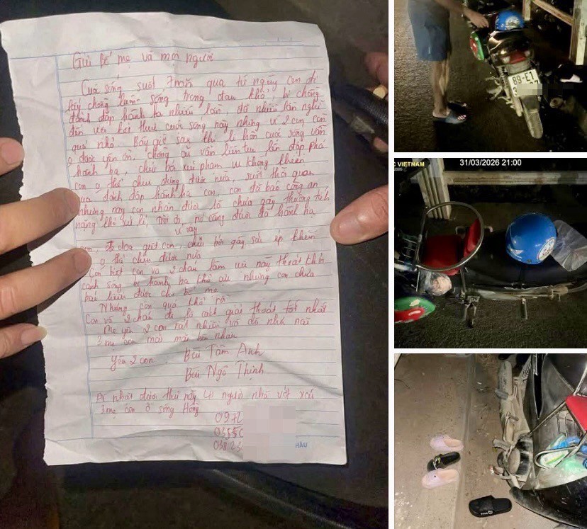 Khoảng 21h ngày 31/3/2026, tại cống Xuân Quan (xã Phụng Công, Hưng Yên), một bức thư viết bằng mực đỏ được để lại cùng chiếc xe máy và đôi dép nhỏ của hai đứa trẻ. Người viết được cho là chị Phạm Thị Tâm, sinh năm 1997, trú tại thôn Đọ, xã Nghĩa Trụ (Hưng Yên). Từ những dấu hiệu ban đầu, không ít người lo rằng ba mẹ con chị đã gieo mình xuống sông.