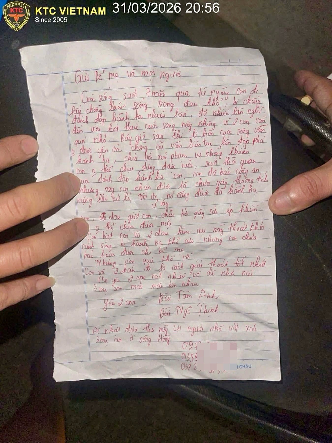 Trong bức thư, chị nhiều lần nhắc đến hai con, gọi tên các con, và viết về việc “3 mẹ con mãi mãi bên nhau”. Những chi tiết ấy cho thấy, nỗi tuyệt vọng không chỉ dành cho bản thân, mà còn là nỗi lo cho các con.