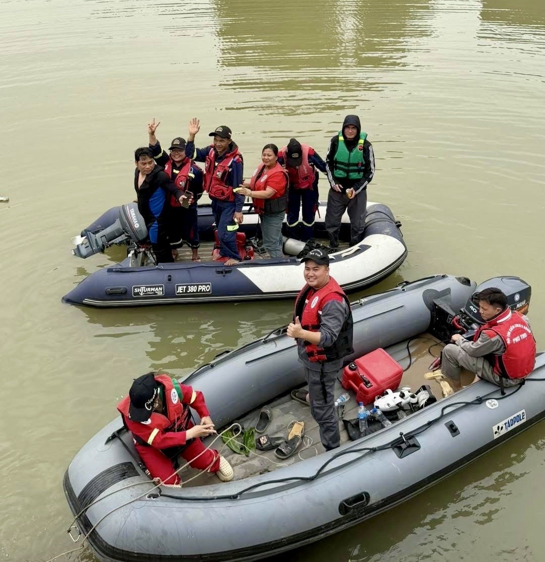 Dưới sông, lực lượng tìm kiếm cứu nạn vui mừng khi biết ba mẹ con chị Phạm Thị Tâm đã bình an. Ảnh: Người dân cung cấp.