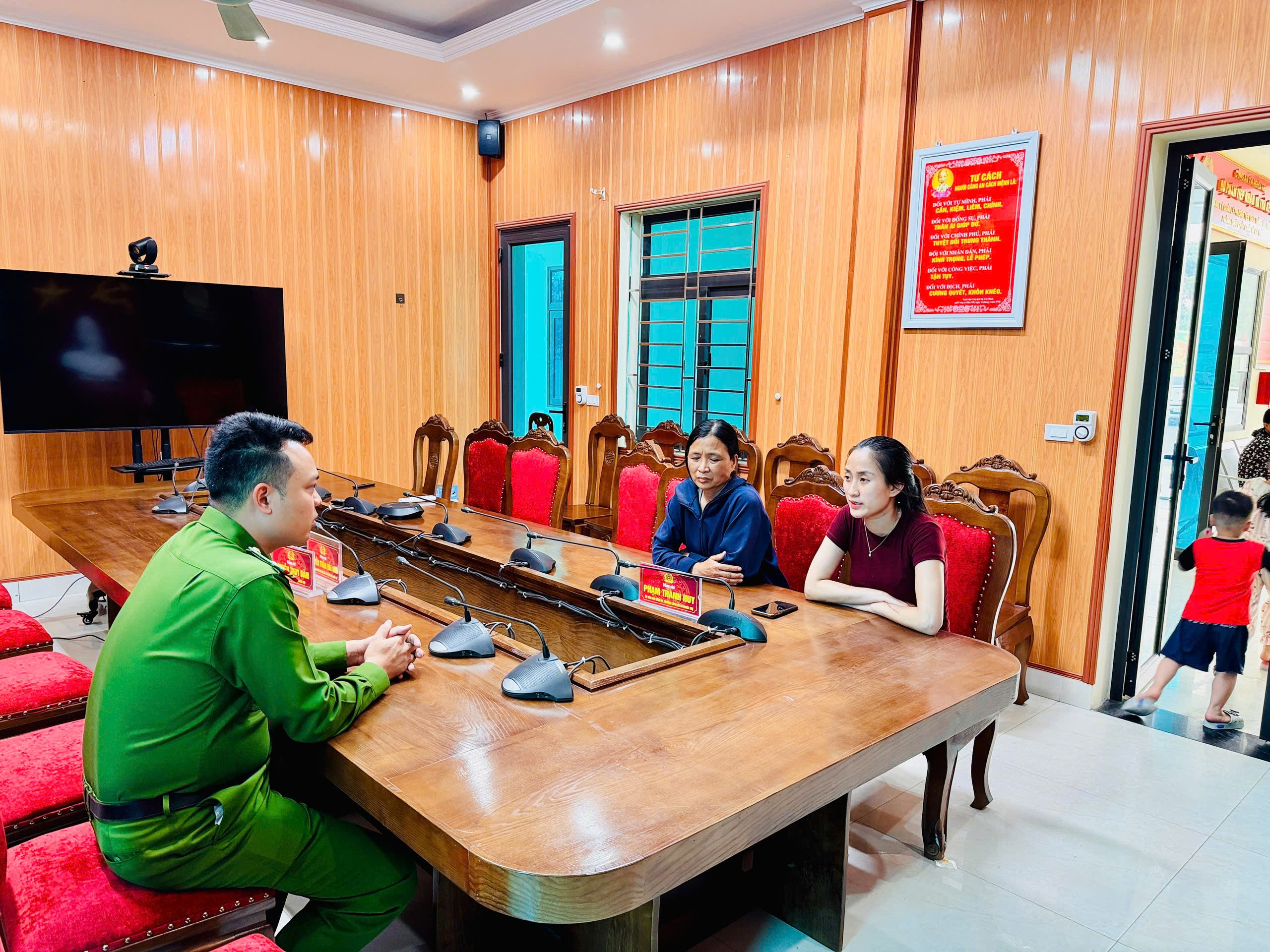 Thiếu tá Phạm Thành Huy - Trưởng Công an xã trực tiếp làm việc với chị Tâm và mẹ đẻ. Ảnh: Công an xã Nghĩa Trụ.