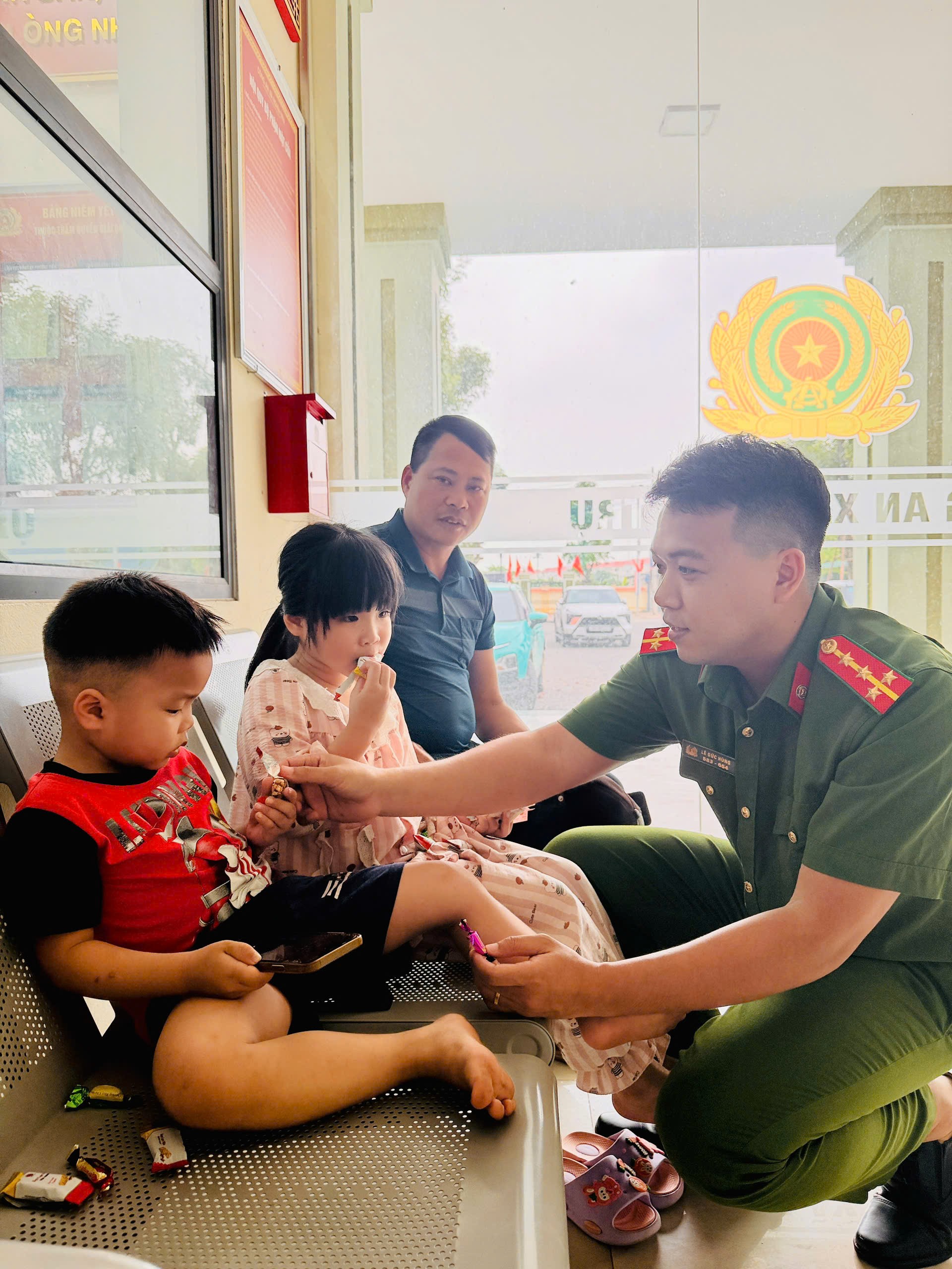 Cán bộ Công an xã Nghĩa Trụ giúp hai cháu nhỏ ổn định tâm lý. Ảnh: Công an xã Nghĩa Trụ.