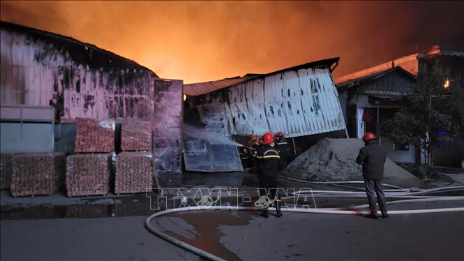 Ghi nhận của phóng viên TTXVN tại hiện trường, khu vực xảy ra cháy có nhiều nhà xưởng chế biến gỗ và tái chế nhựa. Xung quanh còn có những đống gỗ và ni lon. Một số khu vực nhà xưởng đã bị sập đổ. Diện tích đám cháy có thể lên tới hàng nghìn mét vuông. Khu nhà xưởng bị cháy được xây dựng bằng tường gạch, mái lợp tôn. Nguồn nước cho việc chữa cháy không thuận lợi, do vậy việc dập lửa rất khó khăn.
