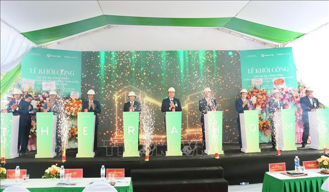 Các đại biểu thực hiện nghi thức khởi công Dự án. Ảnh: Thu Hoài/TTXVN