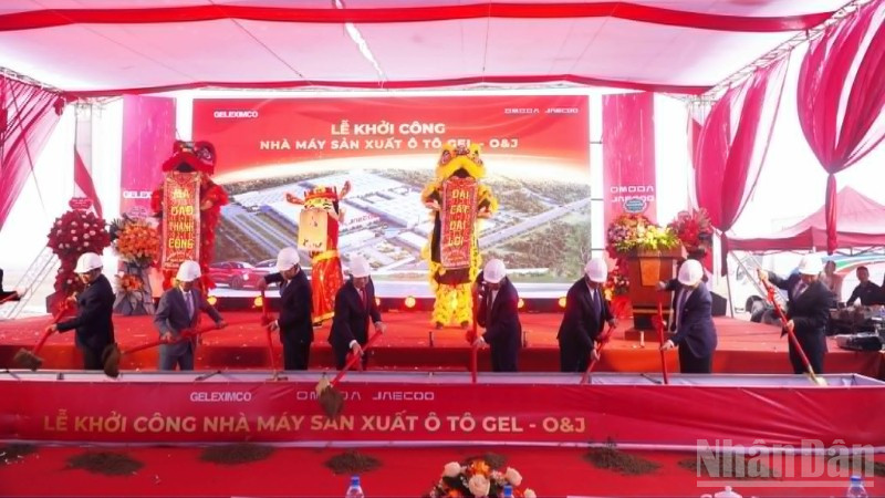Các đại biểu thực hiện nghi thức động thổ khởi công dự án nhà máy sản xuất ô-tô vốn đầu tư 319 triệu USD.