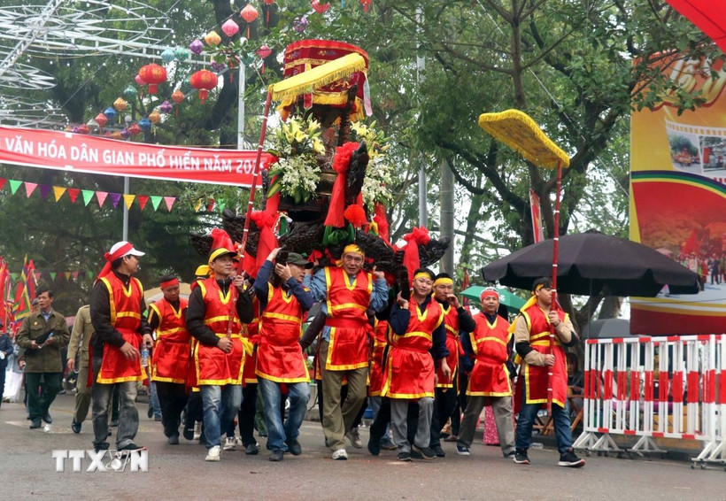 Lễ rước kiệu truyền thống trong Lễ hội văn hóa dân gian Phố Hiến. (Ảnh: Đinh Văn Nhiều/TTXVN)