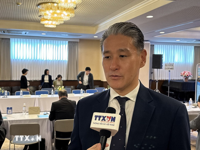 Ông Kenta Kawanabe, Tổng giám đốc Công ty TNHH Khu công nghiệp Thăng Long II trả lời phỏng vấn phóng viên TTXVN tại Nhật Bản. (Ảnh: Phạm Tuân/TTXVN)