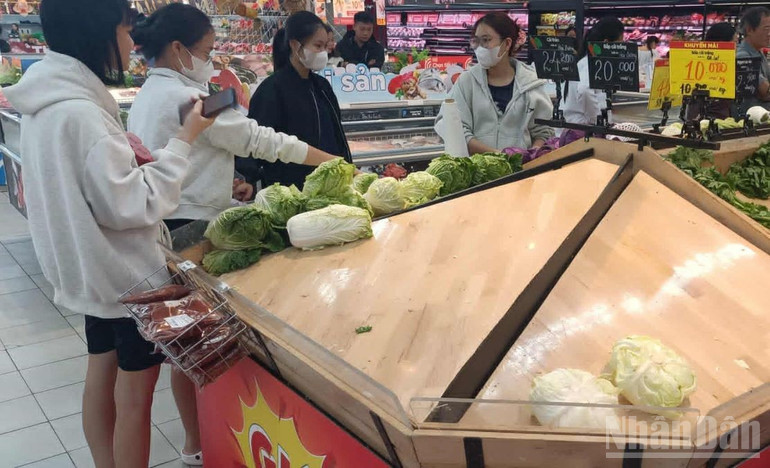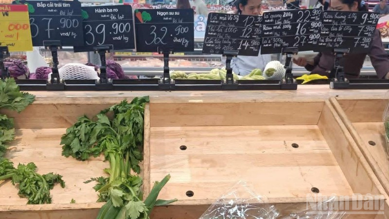Kệ hàng bày bán các loại rau tại Trung tâm thương mại GO (phường Vũ Phúc, tỉnh Hưng Yên) luôn hết hàng từ rất sớm.