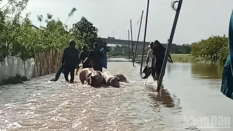 Người dân xã Tân Thuận (Hưng Yên) di chuyển gia súc từ ngoài bãi sông lên nơi cao ráo.