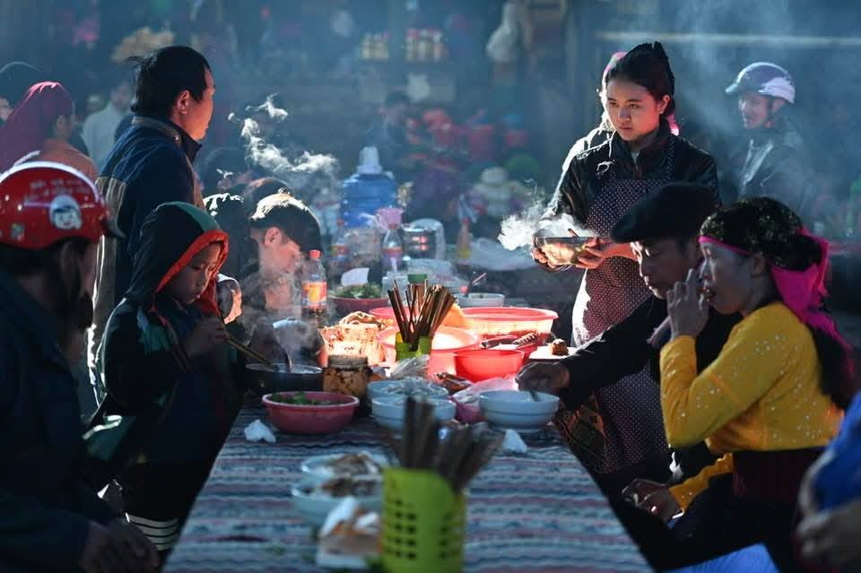 Chúng tôi chọn một dãy bàn ở cuối chợ – nơi còn thưa khách – rồi ngồi xuống gọi mỗi người một bát. Tôi cố gắng nói vài câu bập bẹ tiếng Mông với anh chủ quán, rằng chúng tôi muốn ăn thật nóng, nhiều gia vị, để cảm nhận trọn vẹn hương vị cao nguyên. Anh chủ quán cười xởi lởi, liền cúi xuống cời bếp lò, thêm vài thanh củi nghiến khô. Chỉ một loáng, lửa bùng lên đỏ rực, làm chảo thắng cố khói bốc mù mịt, mùi thơm quyện cùng hương rừng lan tỏa khắp không gian.
