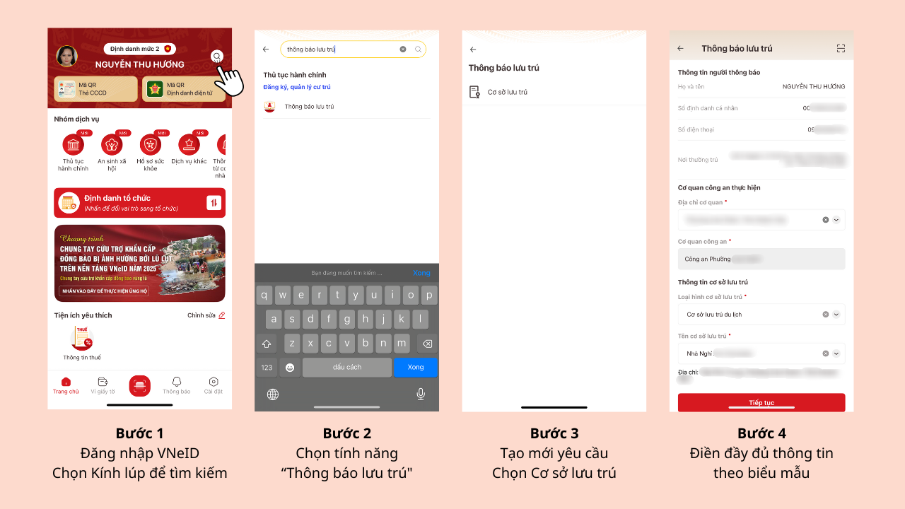 Cách 2: Truy cập Cổng Dịch vụ công Quốc gia hoặc ứng dụng VNeID. Chọn chức năng "Thông báo lưu trú". Điền thông tin người lưu trú, loại hình lưu trú, địa chỉ cụ thể và các thông tin cần thiết khác. Gửi yêu cầu và nhận kết quả (thủ tục này không mất phí).