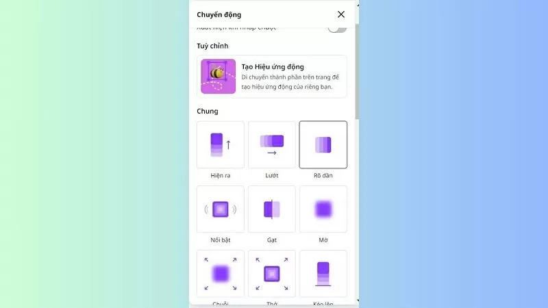 Bước 4: Nhấn vào mục "Chuyển động" để tạo hiệu ứng xoay hoặc các hiệu ứng khác nhằm tăng thêm tính hấp dẫn.