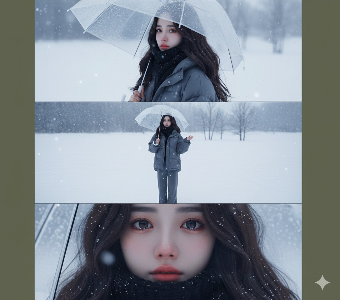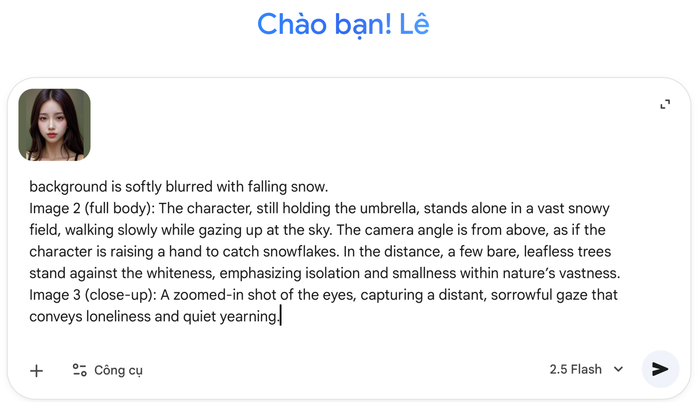 Đầu tiên, bạn cần chọn ảnh gốc chất lượng cao. Ảnh nên có khuôn mặt không bị che khuất và ánh sáng đồng đều, tránh ảnh ngược sáng hoặc quá tối. Tiếp đó, nếu bạn muốn ảnh buồn, suy tư, hãy chọn ảnh gốc có biểu cảm tương tự, vì AI sẽ khuếch đại cảm xúc đó trong bối cảnh mùa Đông. Và, bạn đừng quên chi tiết hóa trang phục trong câu lệnh (áo khoác dài, khăn len, mũ beanie...) để bức ảnh mùa đông trở nên chân thực và "ăn khớp" với phong cách hơn.