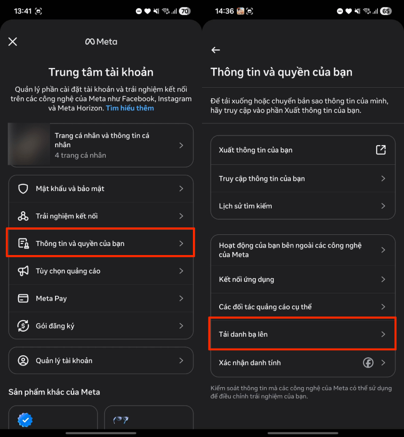 Bước 2: Tại đây, chọn Thông tin và quyền của bạn > Nhấn vào Tải danh bạ lên để xem các tùy chọn liên quan đến việc đồng bộ danh bạ.