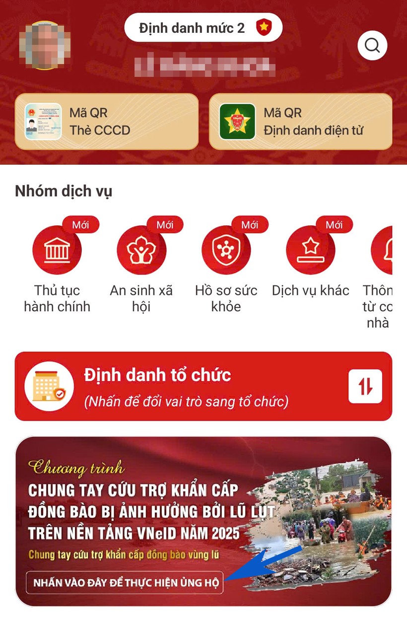 Sau khi đăng nhập VNeID bằng tài khoản của mình, bạn sẽ thấy ở phía dưới trang có hình ảnh chương trình chung tay cứu trợ đồng bào. Bạn bấm vào nút "Nhấn vào đây để thực hiện ủng hộ".