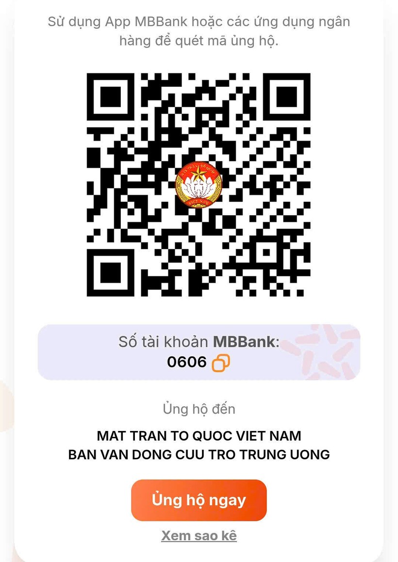 Lúc này ứng dụng hiển thị một mã QR liên kết đến Ngân hàng MB Bank với số tài khoản của Mặt trận Tổ quốc Việt Nam - Ban Vận động cứu trợ trung ương. Bạn có thể dùng app ngân hàng của mình để quét mã trực tiếp hoặc bấm vào nút "Ủng hộ ngay" thực hiện chuyển khoản.