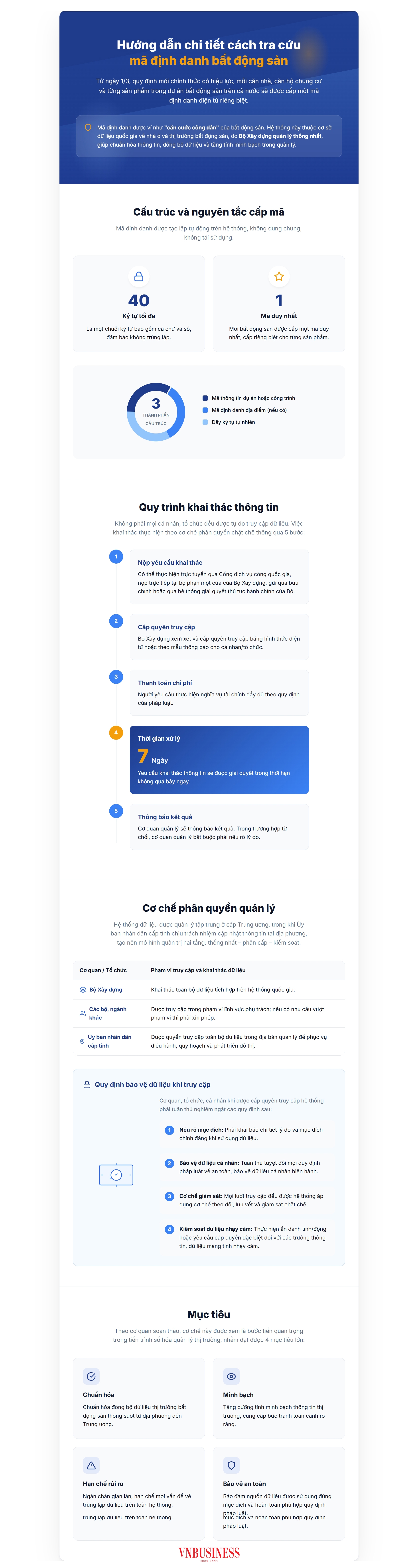 Đáng chú ý, việc khai thác dữ liệu cá nhân và dữ liệu chủ thể phải tuân thủ nghiêm quy định về bảo vệ dữ liệu cá nhân và cơ chế quản trị dữ liệu quốc gia. Với thông tin nhạy cảm, hệ thống yêu cầu ẩn danh hoặc cấp quyền đặc biệt. Mã định danh là chuỗi tối đa 40 ký tự, được tạo tự động, bảo đảm duy nhất cho từng bất động sản và được quản lý thống nhất trên toàn quốc.
