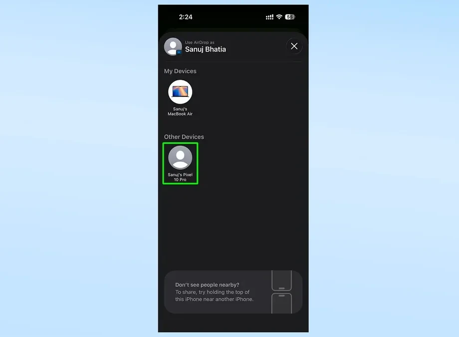 Chọn thiết bị iPhone xuất hiện trên giao diện Quick Share của Pixel.