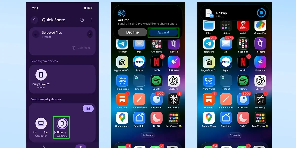 Trên màn hình Pixel 10, tên iPhone của bạn sẽ xuất hiện trong danh sách các thiết bị lân cận. Nhấn vào đó để gửi. Một thông báo sẽ hiện lên trên iPhone, hãy nhấn "Chấp nhận" (Accept) để bắt đầu nhận tệp.