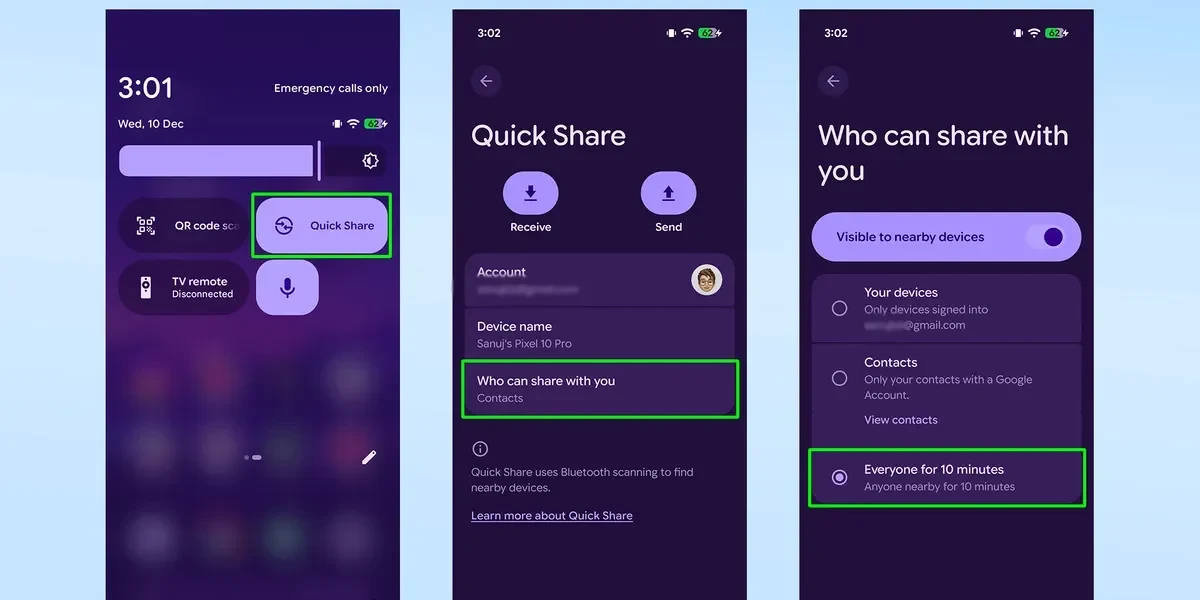 Mở bảng Cài đặt nhanh (Quick Settings) trên Pixel 10, nhấn giữ vào biểu tượng Quick Share. Trong mục "Ai có thể chia sẻ với bạn" (Who can share with you), chọn "Mọi người trong 10 phút" (Everyone for 10 minutes).