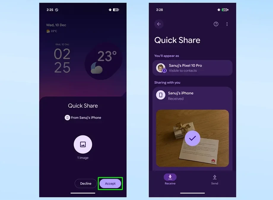 Một thông báo Quick Share sẽ hiện lên trên Pixel 10. Nhấn "Chấp nhận" (Accept) để quá trình truyền tệp bắt đầu. Tệp sau khi nhận sẽ được lưu trong thư mục Quick Share, có thể truy cập qua ứng dụng Google Photos hoặc trình quản lý tệp.