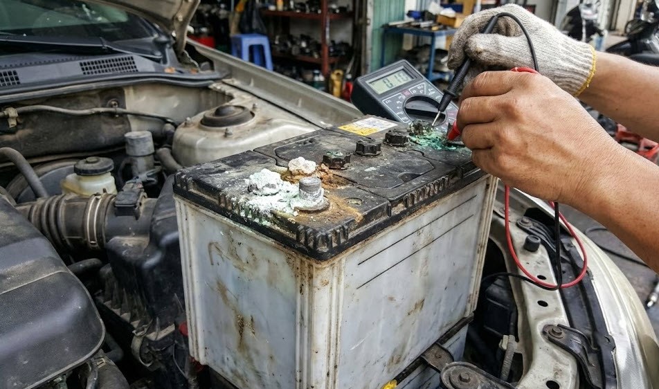Bình ắc quy ô tô cũ có dấu hiệu yếu điện, cần kiểm tra và thay thế.