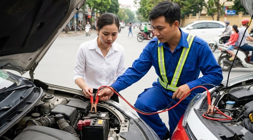 Kỹ thuật viên hướng dẫn kích bình ắc quy ô tô đúng cách bằng dây câu