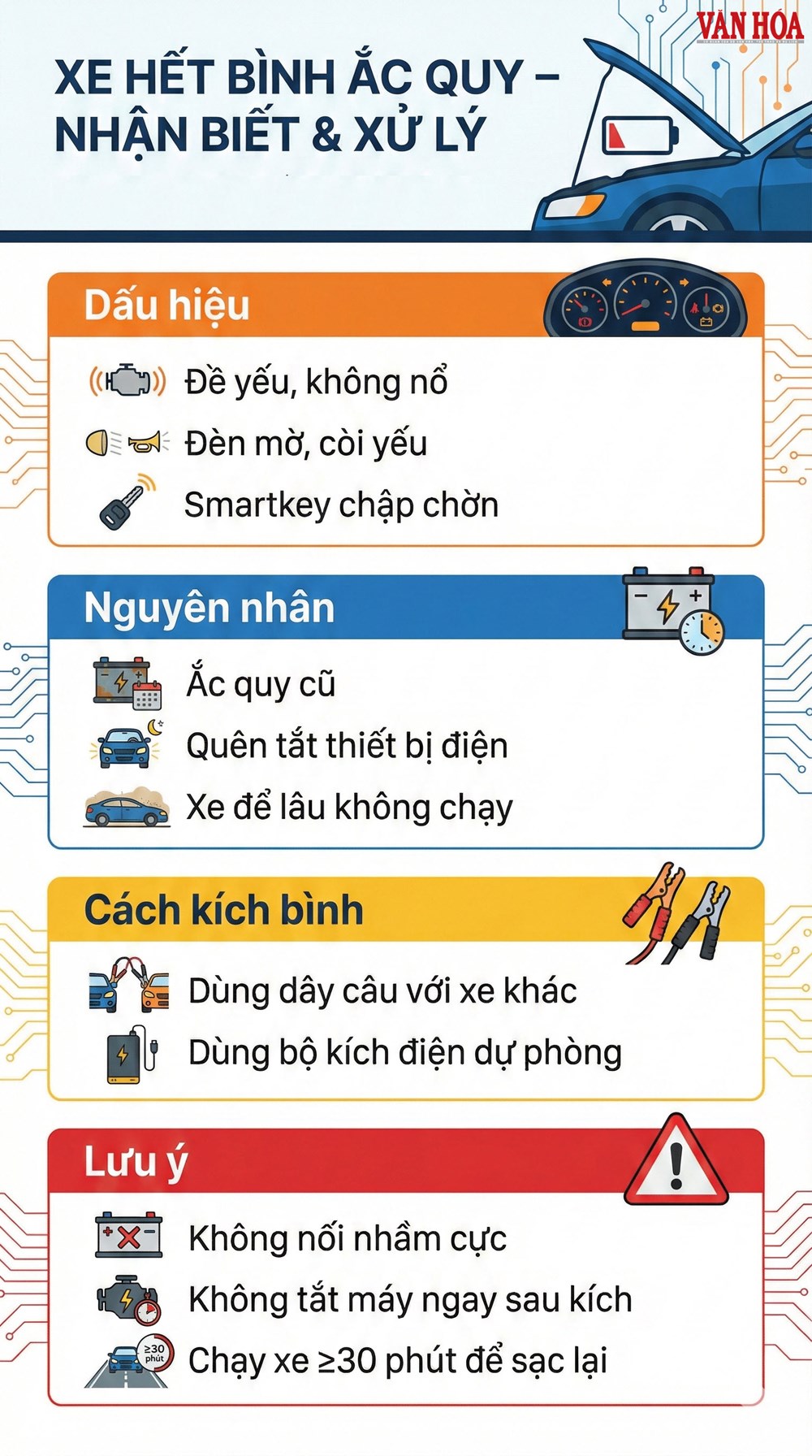 Xe hết bình ắc quy là sự cố phổ biến nhưng hoàn toàn có thể nhận biết sớm và xử lý an toàn nếu người lái hiểu rõ dấu hiệu và quy trình kích bình đúng cách. Chủ động kiểm tra, bảo dưỡng ắc quy không chỉ giúp xe vận hành ổn định mà còn tránh những tình huống “dở khóc dở cười” giữa đường.