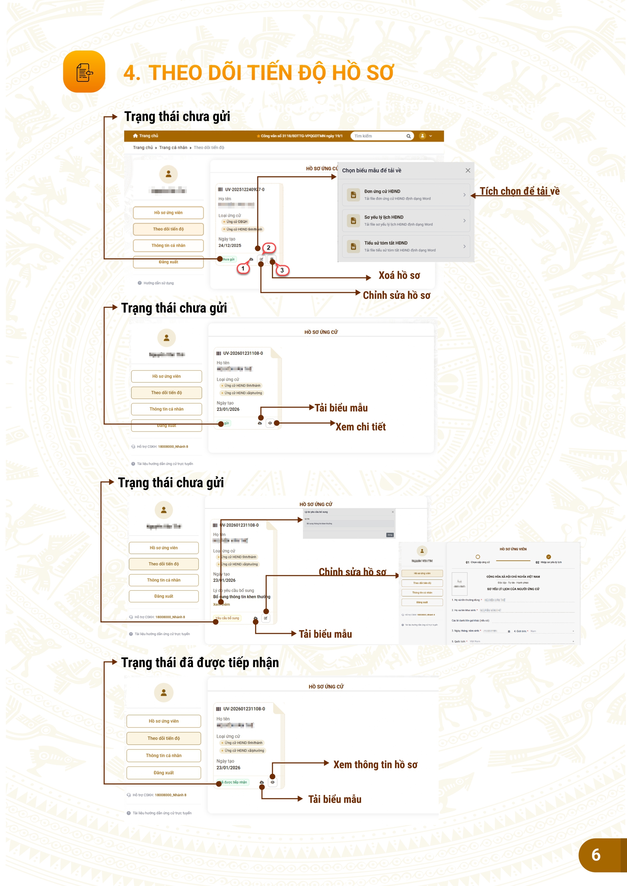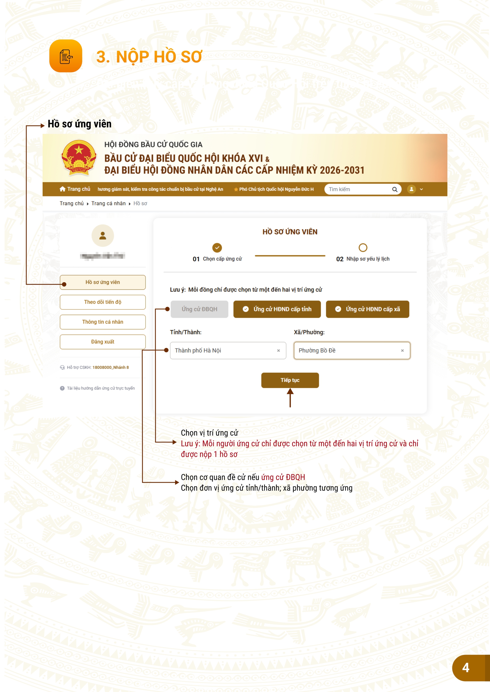 Sau khi đăng nhập thành công, người dùng sẽ thực hiện theo hướng dẫn, như: loại hình ứng; Kê khai thông tin; Kiểm tra và Xác nhận dữ liệu để đảm bảo tính chính xác, sau đó gửi hồ sơ trực tuyến. Sau khi gửi thành công, hệ thống sẽ cấp một Mã hồ sơ. Người ứng cử cần lưu lại mã này để phục vụ việc đối chiếu và theo dõi tiến độ xử lý…