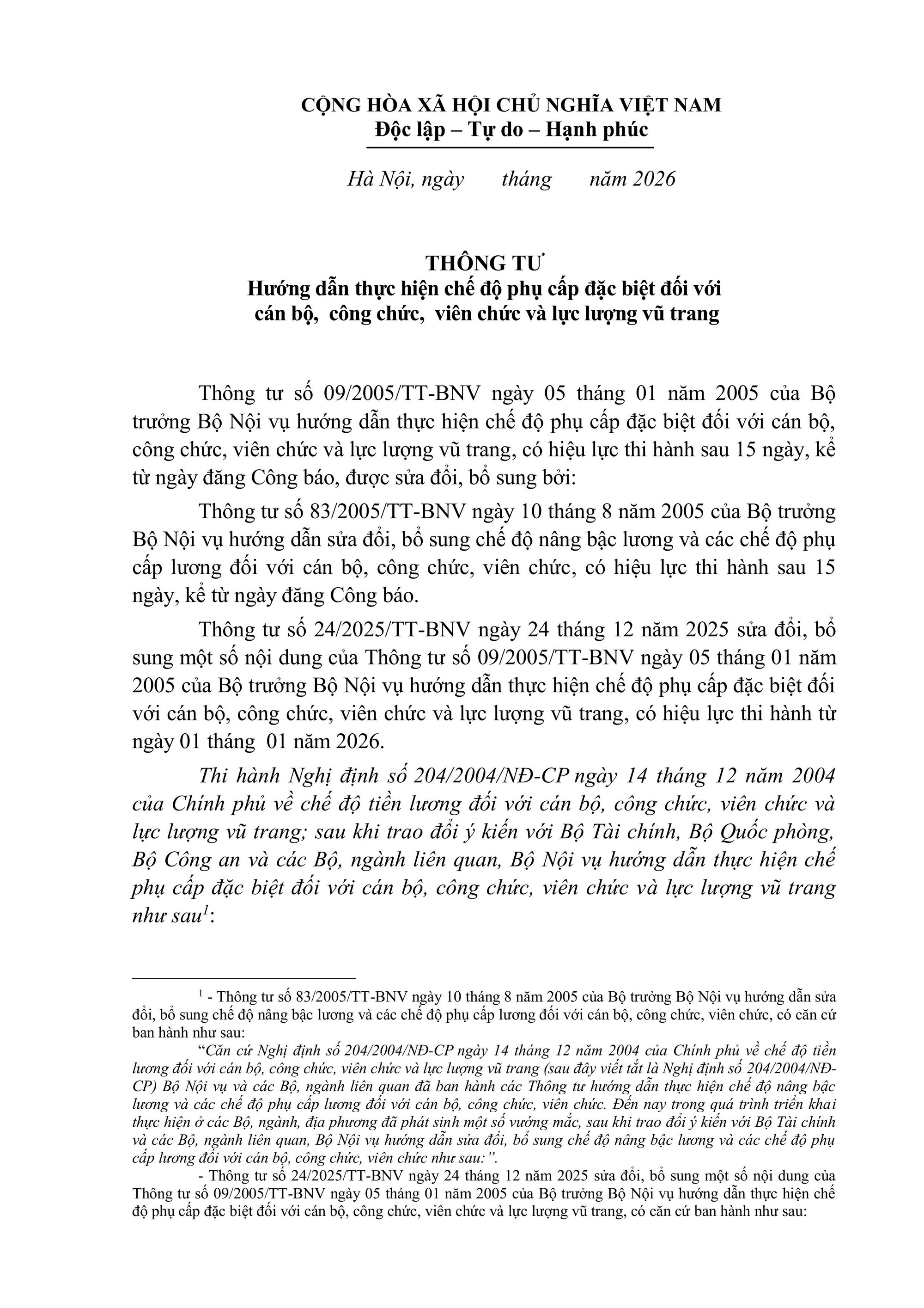 Bộ Nội vụ ban hành Văn bản hợp nhất số 02/VBHN-BNV ngày 22/01/2026 hướng dẫn thực hiện chế độ phụ cấp đặc biệt đối với cán bộ, công chức, viên chức và lực lượng vũ trang.