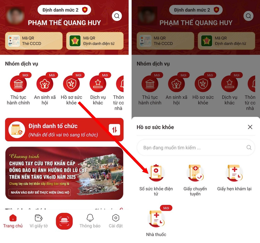 Mở ứng dụng VNeID truy cập Sổ sức khỏe điện tử.