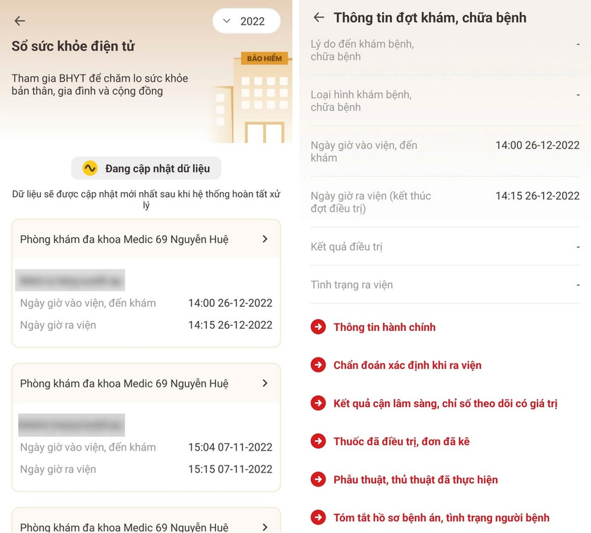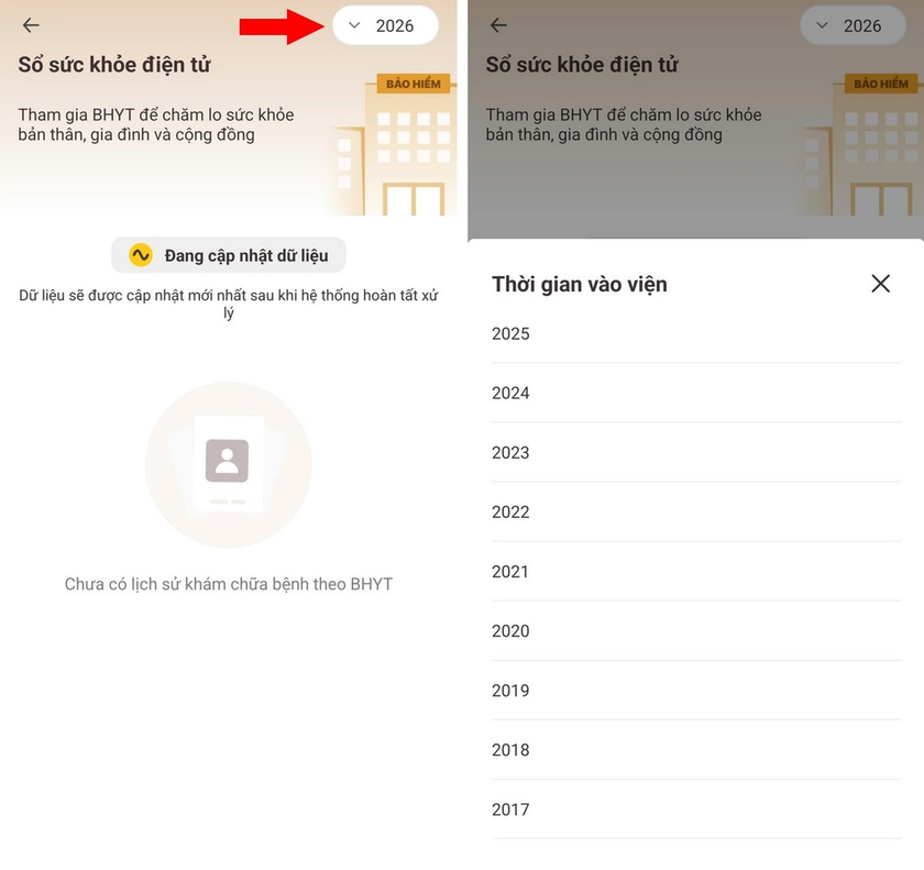 - Trong màn hình Sổ sức khỏe điện tử, bạn có thể chọn từng năm để xem lại các lần khám bệnh đã được lưu. Nếu năm nào hiện "Đang cập nhật dữ liệu", tức là bạn không có lịch sử khám trả bảo hiểm y tế trong năm đó.