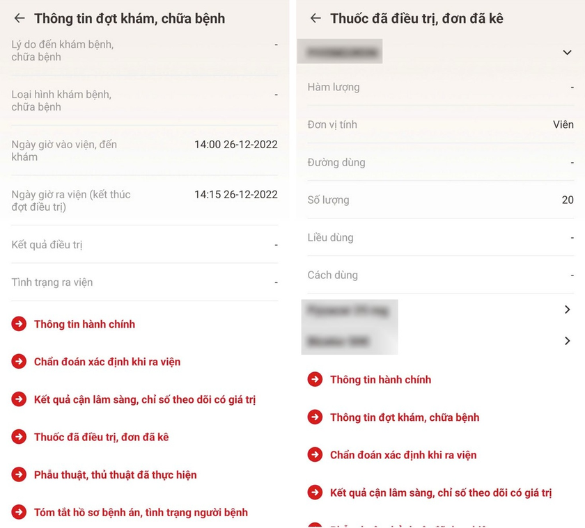 - Khi chọn một lần khám cụ thể, bạn sẽ thấy thông tin chi tiết như: ngày khám, nơi khám, chẩn đoán, kết quả xét nghiệm và cận lâm sàng, phẫu thuật (nếu có). - Trong phần chi tiết đó, chọn "Thuốc đã điều trị, đơn đã kê" để xem danh sách thuốc bác sĩ đã kê cho bạn trong lần khám đó (thuốc nằm trong danh mục BHYT chi trả).