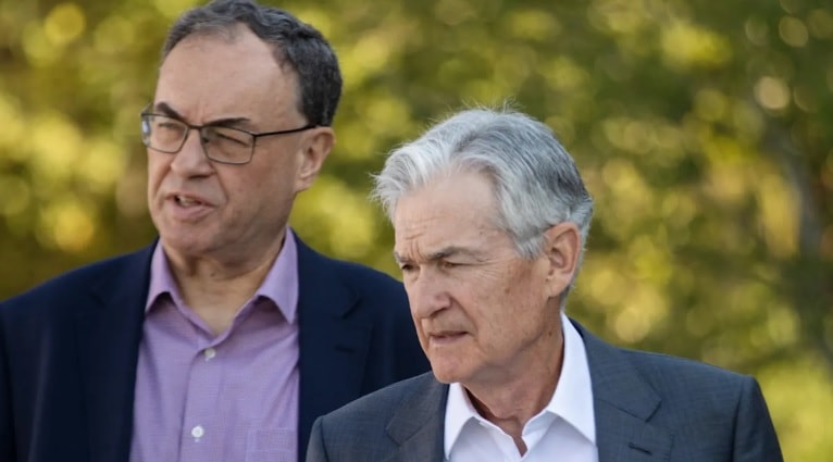 Thống đốc Ngân hàng Trung ương Anh (BoE) Andrew Bailey (trái) đã thể hiện lập trường rõ ràng theo hướng “diều hâu” tại cuộc họp quyết định lãi suất tuần trước, trong khi Chủ tịch Cục Dự trữ Liên bang Mỹ (Fed) Jay Powell lại có giọng điệu thận trọng và ít cam kết hơn. Ảnh: FT