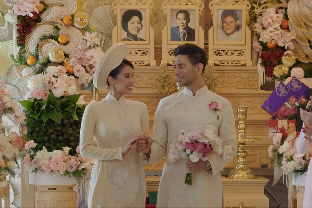 Tiên Nguyễn và chú rể Justin Cohen trong lễ gia tiên.