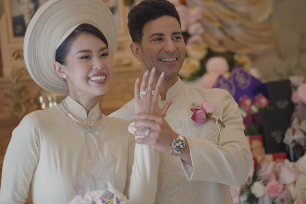 Cô dâu Tiên Nguyễn diện áo dài trắng kem thêu hoa sen nổi tuyệt đẹp, trong khi chú rể ngoại quốc Justin Cohen cũng mặc áo dài nam thể hiện sự tôn trọng văn hóa Việt Nam. Việc gia đình tỷ phú lựa chọn hoa sen làm biểu tượng chính thể hiện sự tinh tế trong việc tôn vinh truyền thống và là lời chúc phúc cho đôi uyên ương.