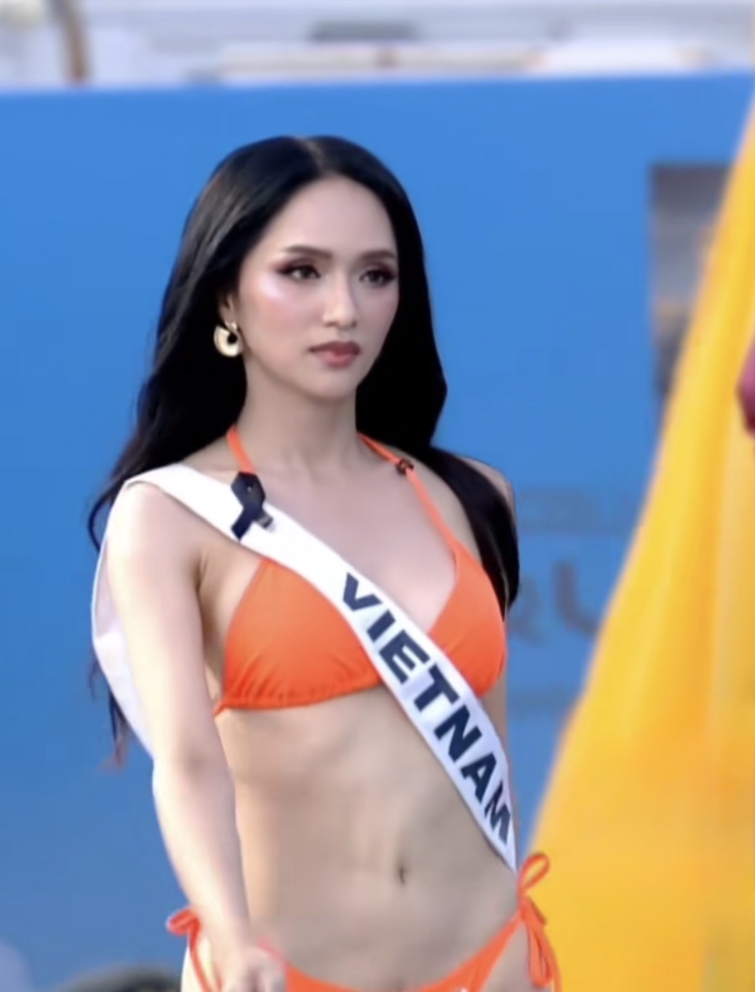 Hương Giang xuất hiện trong thiết kế bikini hai mảnh màu cam rực rỡ, để kiểu tóc uốn xoăn nhẹ ở lọn, buông xõa tự nhiên. Màn trình diễn của cô thu hút sự chú ý của dân mạng. Tuy nhiên, một số ý kiến cho rằng người đẹp để lộ sự căng thẳng, thiếu tự tin khi catwalk.