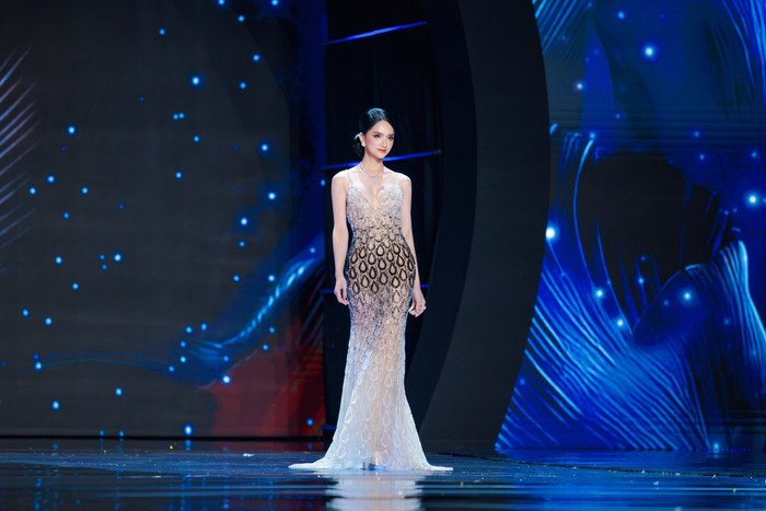 Trong đêm thi, Hương Giang chọn thiết kế ôm sát, được xử lý theo tông chuyển màu từ trắng kem sang đen, phủ dày các chi tiết đính kết mô phỏng giọt nước.
