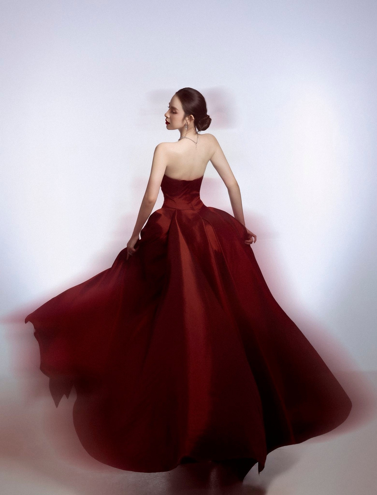 Trong những shoot hình chính, nữ người mẫu diện chiếc váy dạ hội màu đỏ rực rỡ được thiết kế tinh tế với phần cúp ngực gợi cảm, khoe khéo bờ vai trần và xương quai xanh quyến rũ.