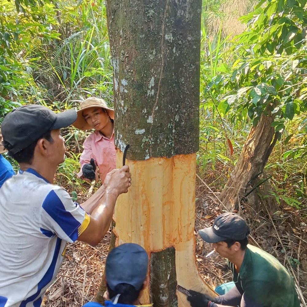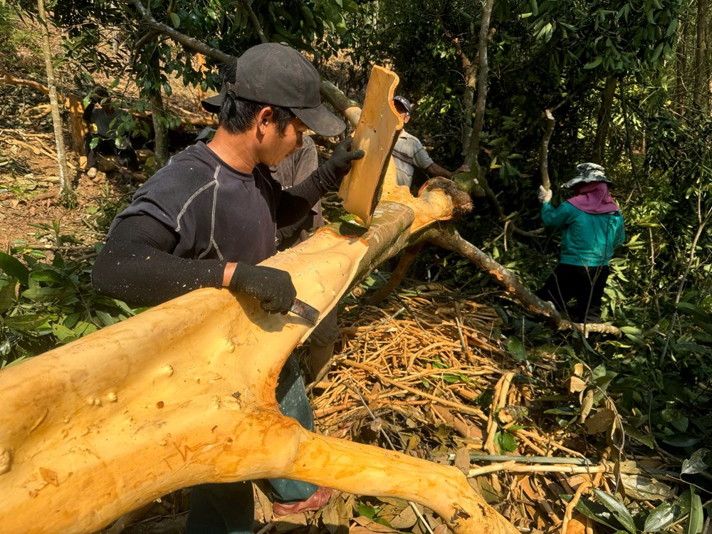Quá trình bóc vỏ đòi hỏi sự phối hợp của nhiều người: người kéo, người cạy, người hỗ trợ phía dưới. Sau lớp vỏ dày là phần thân gỗ vàng nhạt, nơi nhựa quế chảy thành từng vệt dài – minh chứng cho hàm lượng tinh dầu cao.