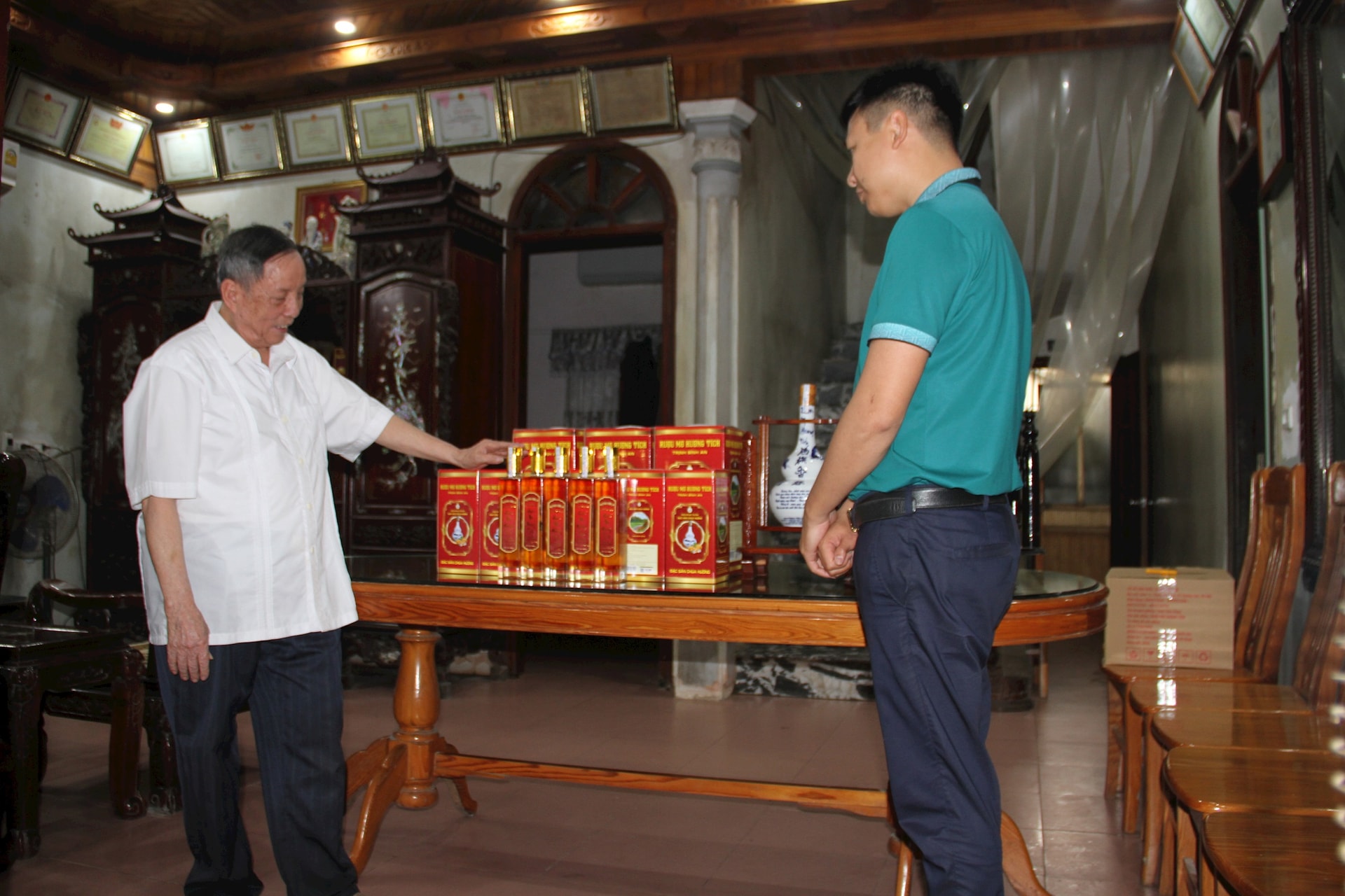 Ông Trịnh Tiến Dũng (áo trắng) chia sẻ công thức sản xuất rượu mơ với Phó phòng Kinh tế xã Hương Sơn Hoàng Văn Hoàn. Ảnh: VB
