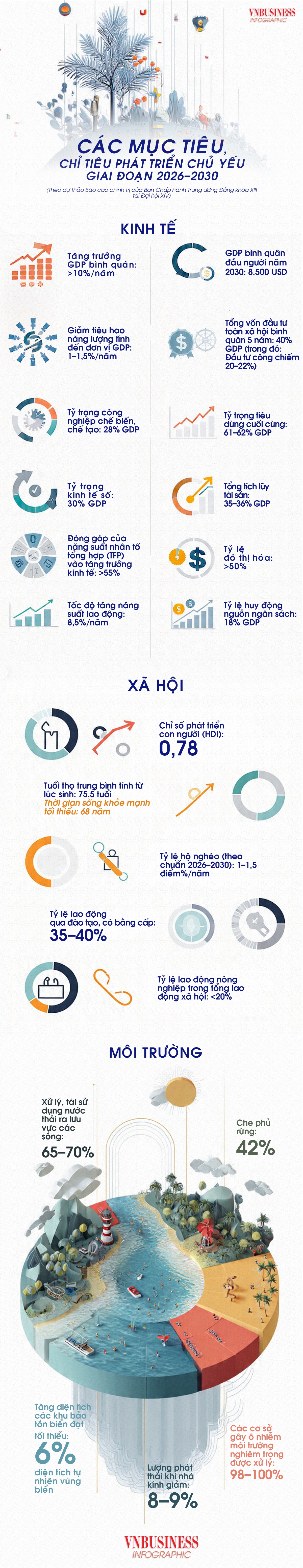 Theo đó, tốc độ tăng trưởng kinh tế bình quân trong giai đoạn này phấn đấu đạt trên 10%/năm, GDP bình quân đầu người đến năm 2030 khoảng 8.500 USD.