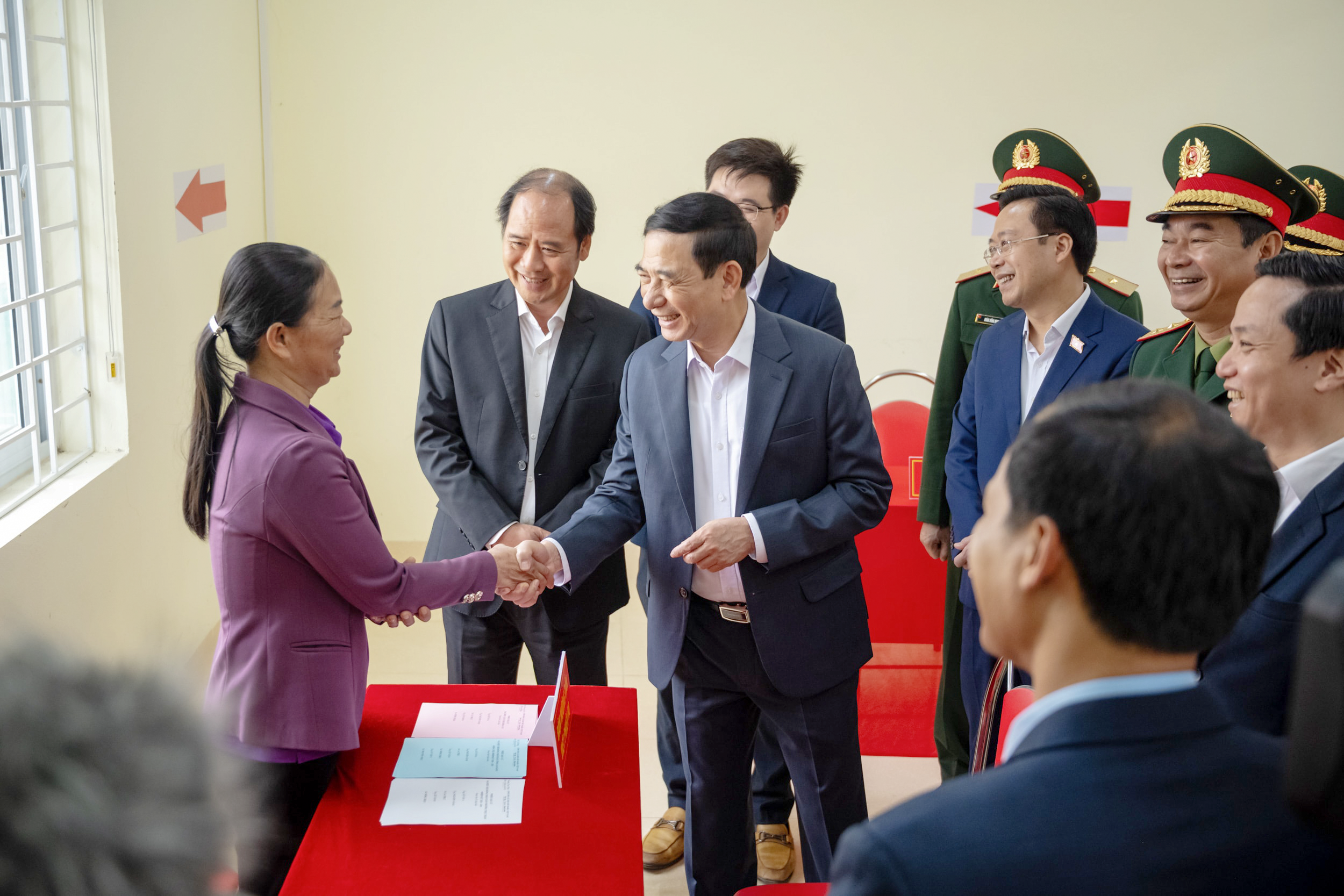 Đoàn giám sát, kiểm tra của Ủy ban Thường vụ Quốc hội và Hội đồng Bầu cử quốc gia kiểm tra thực tế tại Khu vực bỏ phiếu số 18, Trụ sở Ban Chỉ huy quân sự phường Thục Phán. Ảnh: Phạm Thắng