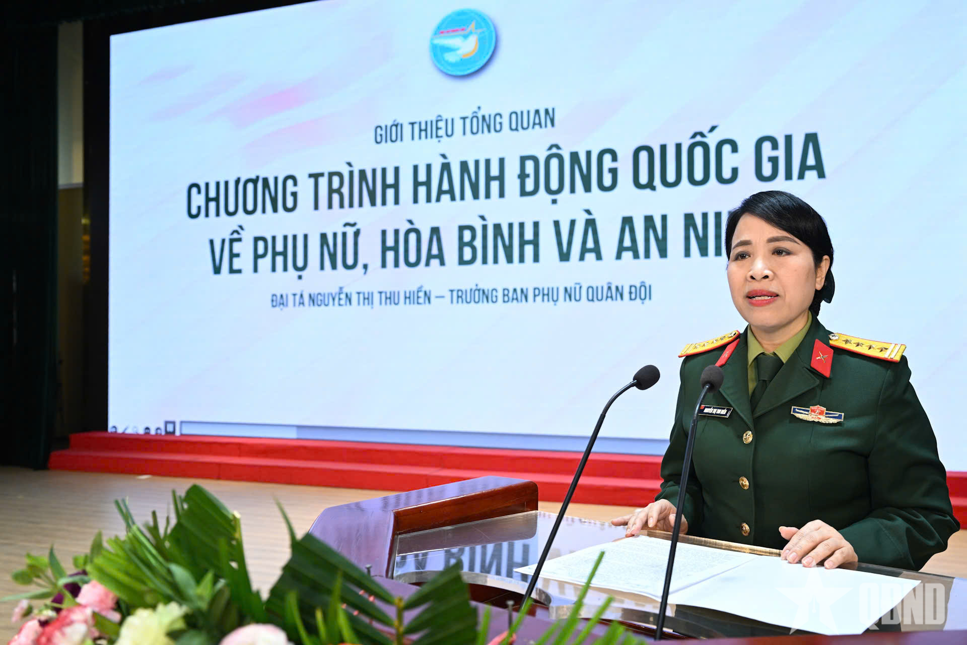 Đại tá Nguyễn Thị Thu Hiền, Trưởng ban Phụ nữ Quân đội giới thiệu tổng quan Chương trình hành động quốc gia về Phụ nữ, hòa bình và an ninh tại Việt Nam.