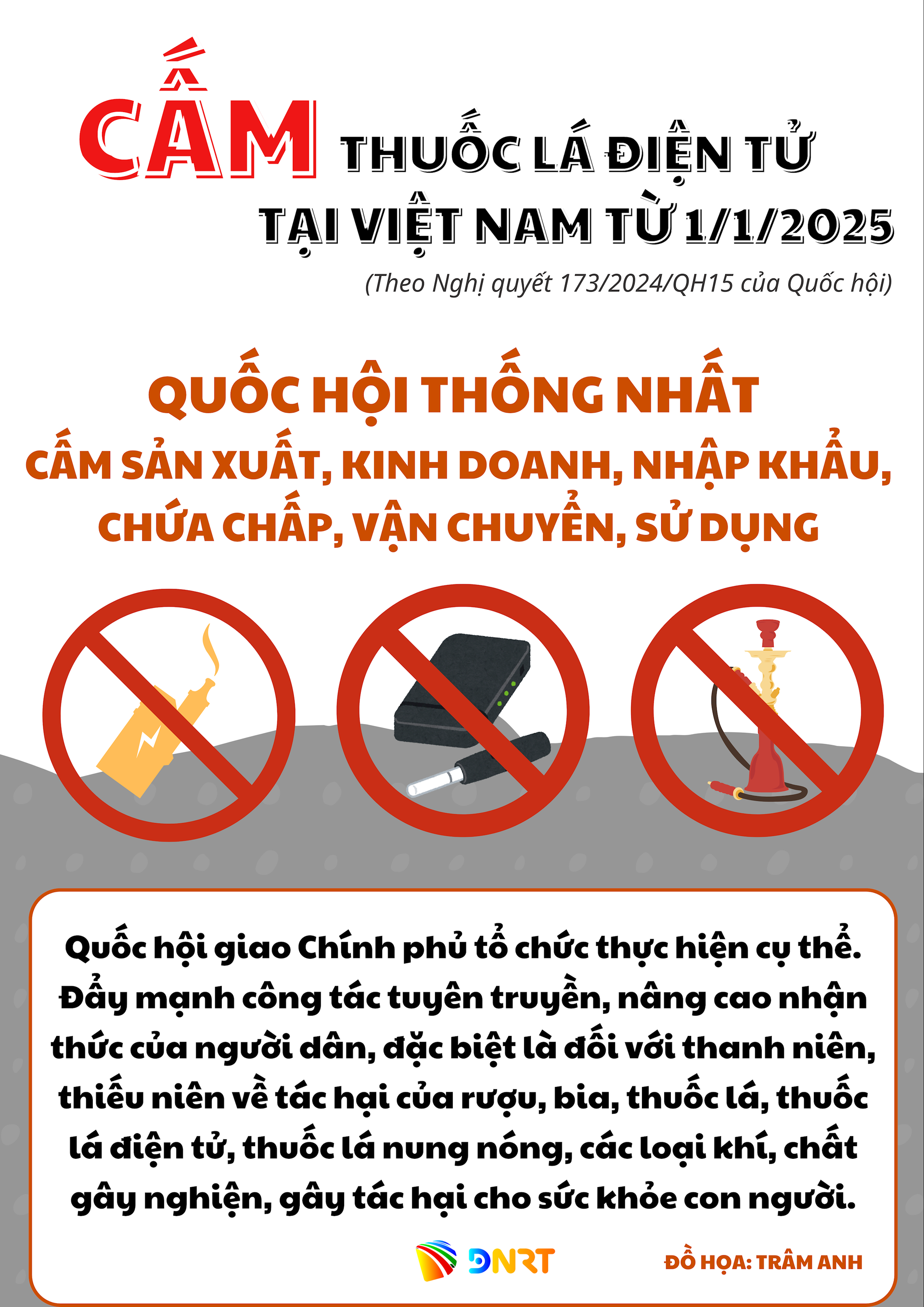 Tại kỳ họp tháng 11/2024, Quốc hội Việt Nam thống nhất chủ trương cấm toàn diện việc sản xuất, kinh doanh, nhập khẩu và sử dụng thuốc lá điện tử, thuốc lá nung nóng từ năm 2025.