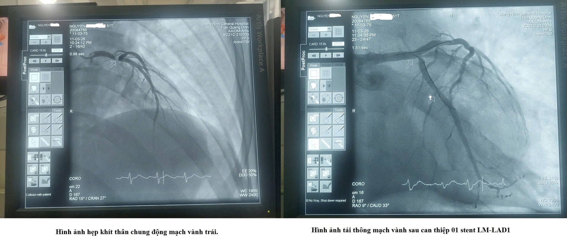 Tại Bệnh viện Đa khoa tỉnh Quảng Ninh, bệnh nhân được thở máy, sử dụng thuốc vận mạch và can thiệp động mạch vành qua da ngay trong đêm. Kết quả chụp mạch vành cho thấy hẹp khít thân chung động mạch vành trái. Các bác sĩ đã đặt một stent từ thân chung động mạch vành trái đến động mạch liên thất trước, giúp tái thông mạch máu. Hiện bệnh nhân đã qua cơn nguy kịch và đang được tiếp tục theo dõi, hồi sức tích cực.